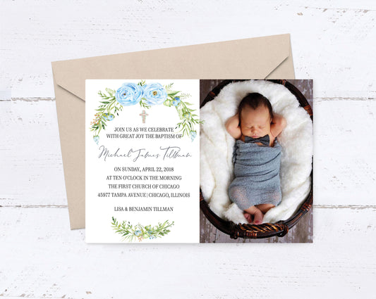 Floral Boy Baptism Christening Photo Invitation