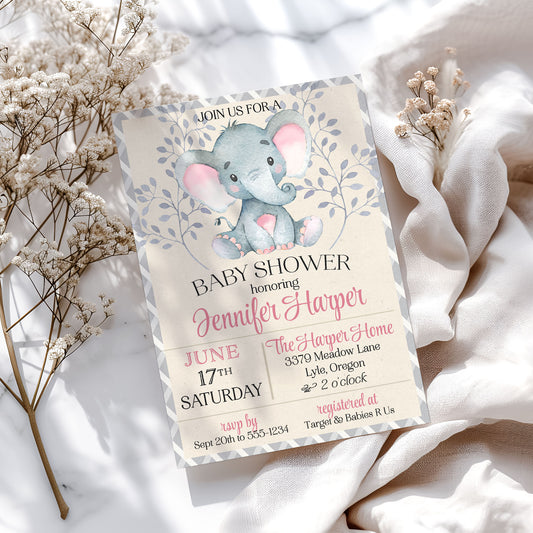 Pink Elephant Baby Shower Invitation