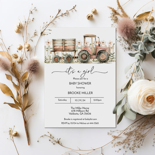 Pink Tractor Farm Baby Shower Invitation