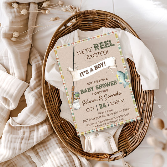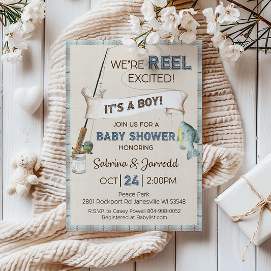 We're REEL Excited Fishing Blue Baby Shower Invitation