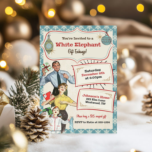 Vintage Family Fun White Elephant Christmas Invitation