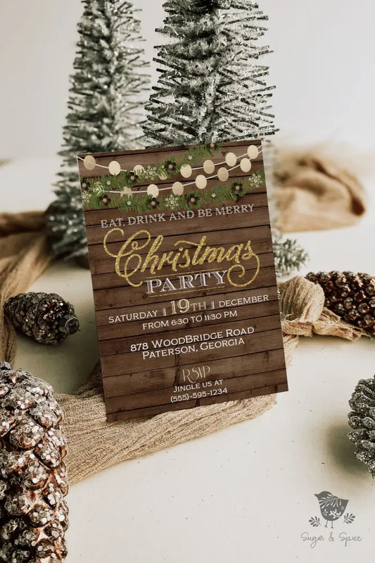 Rustic Gold and Evergreen Christmas Party Invitation