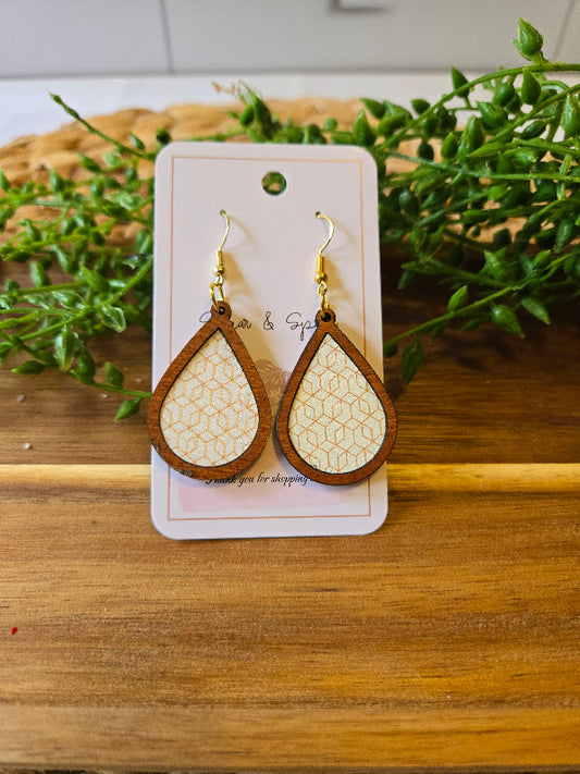 Gold Modern Pattern Wood Inlay Teardrop Earrings