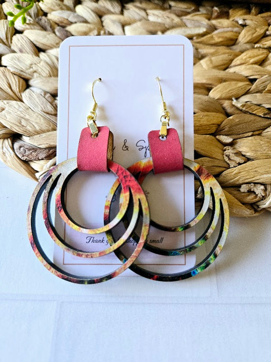 Colorful Rainbow Hoops with Pink Leather Dangle Earrings
