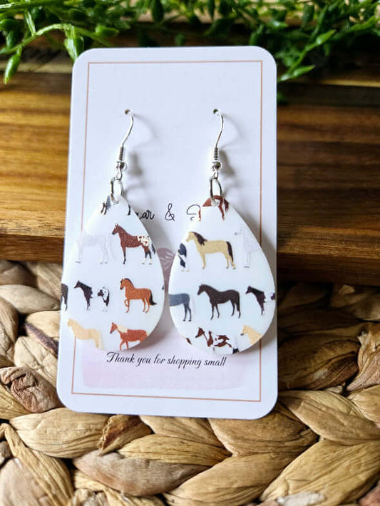 Horse Lover Teardrop White Acrylic Earrings