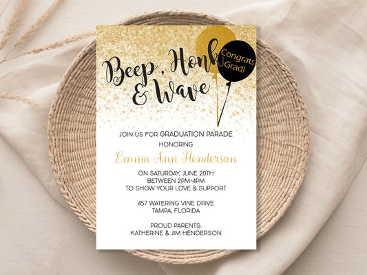 Honk, Beep and Wave Black and Gold Graduation Invitation
