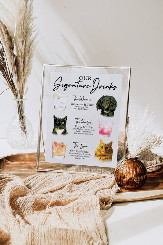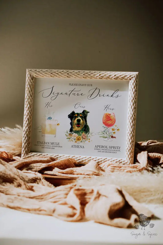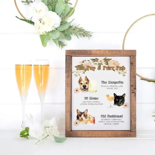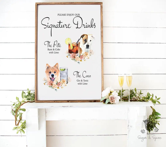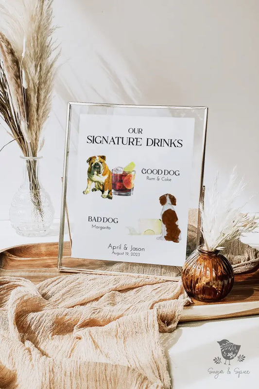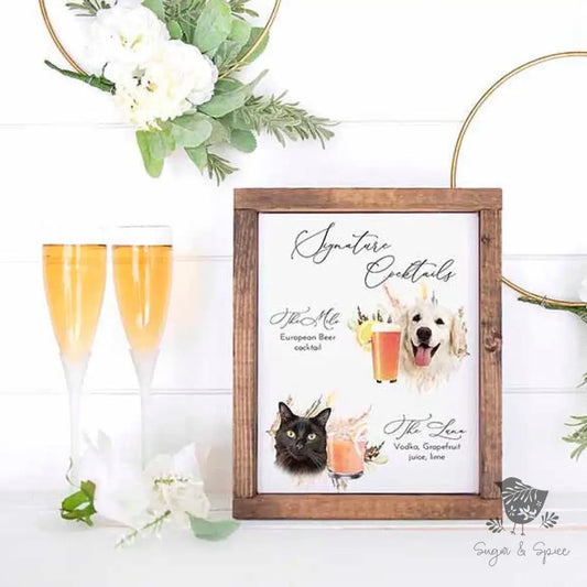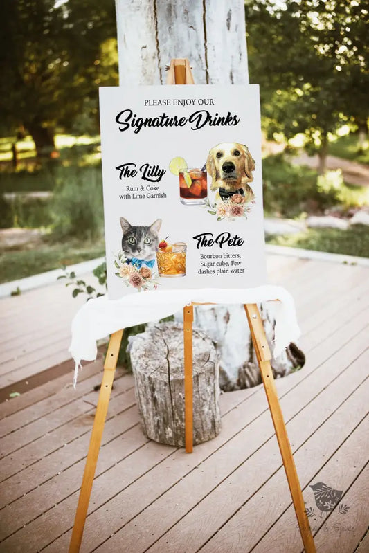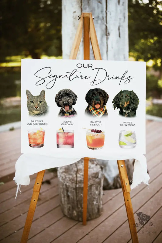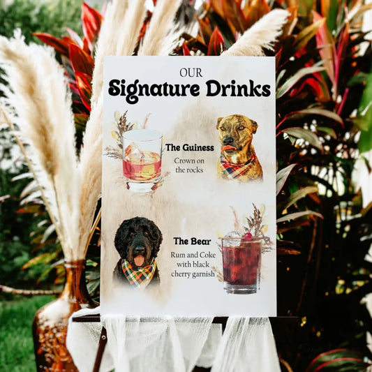 Make your wedding an unforgettable experience by adding a touch of uniqueness to it with our signature drink and pet signs! Our signs are not only stylish and elegant, but they will also add a personal touch to your big day. Your guests will be impressed, and including your best friend in the celebration will make it even more special! Don't miss the chance to make your wedding stand out - order your signs today!