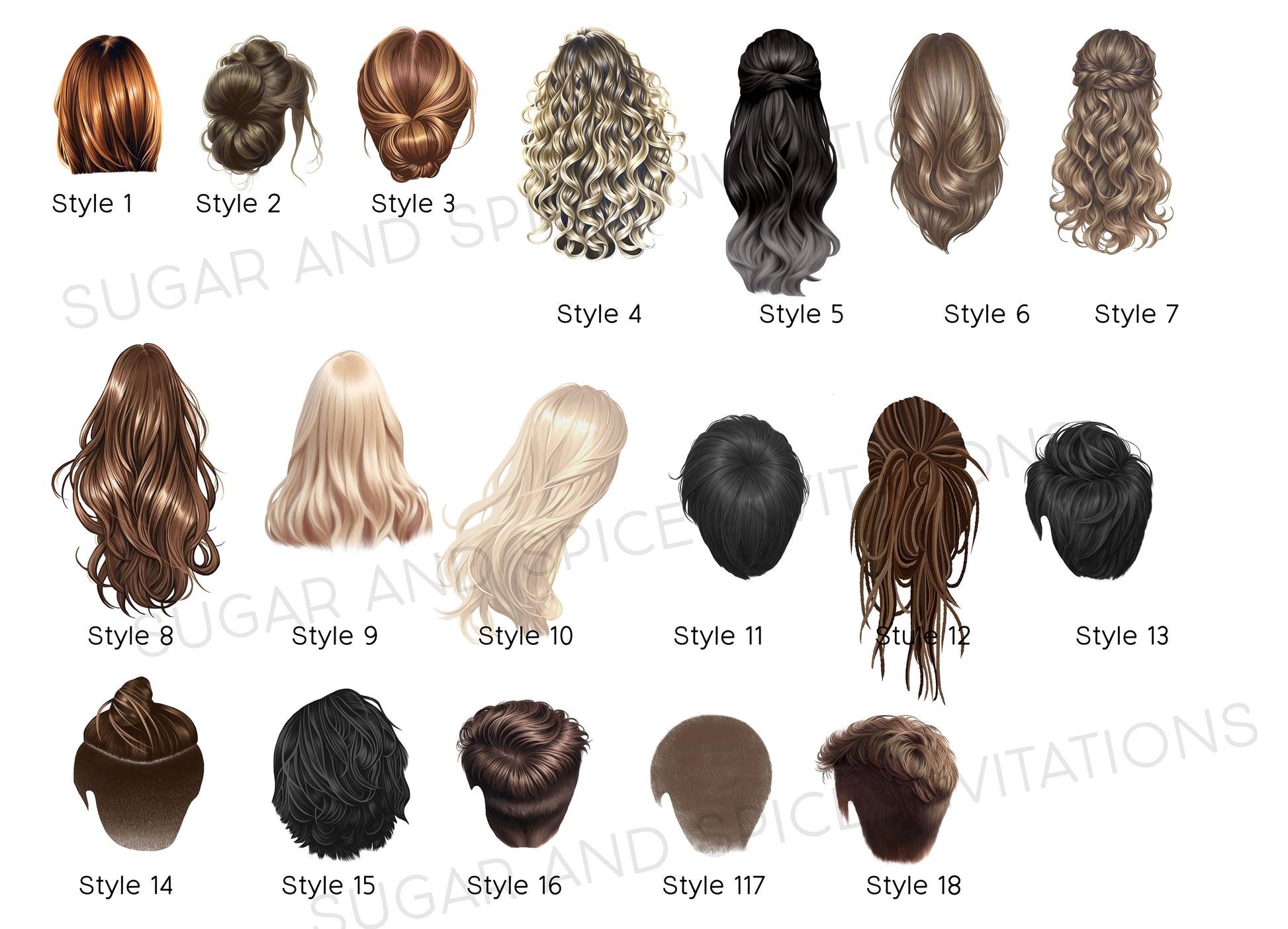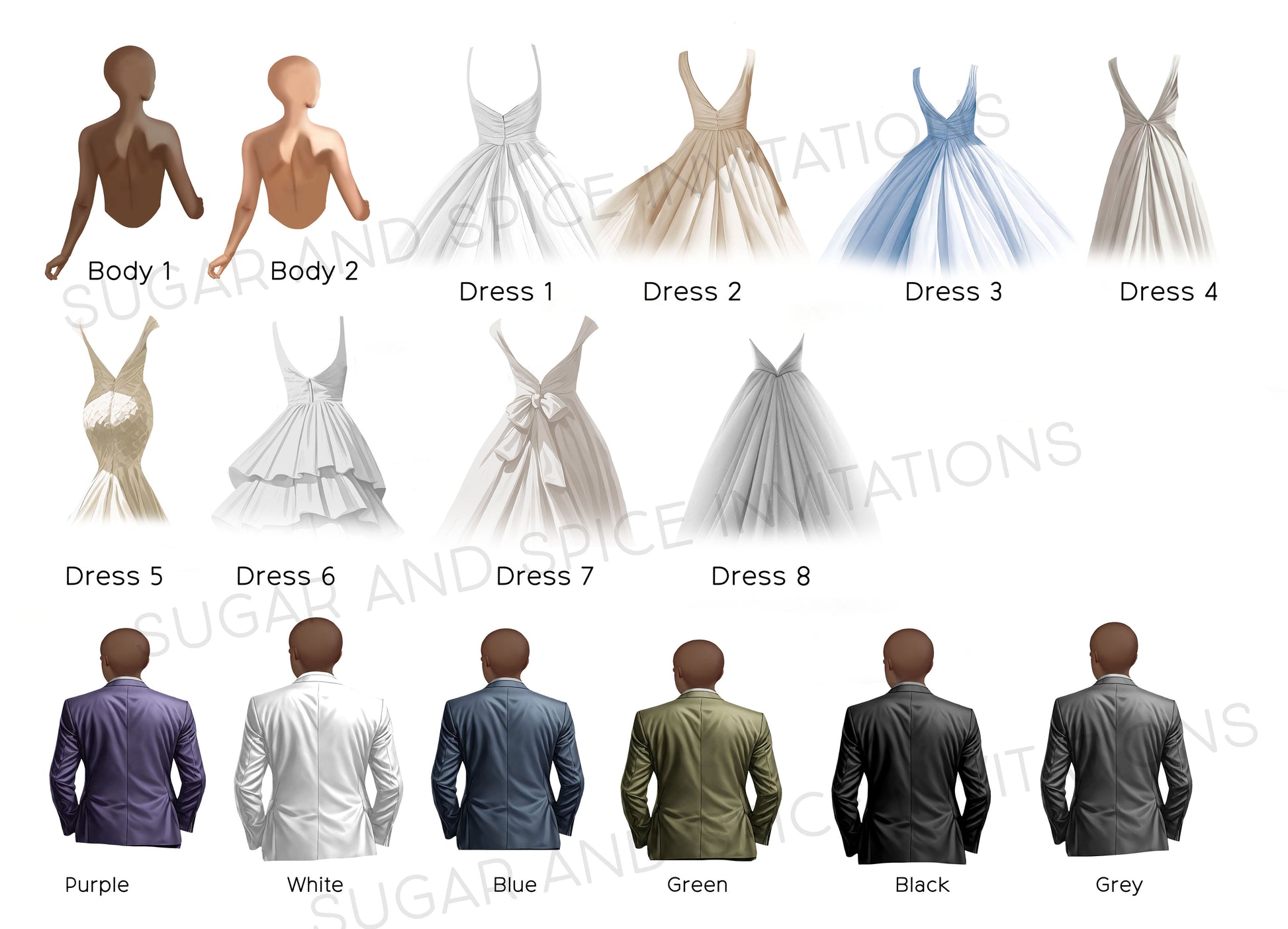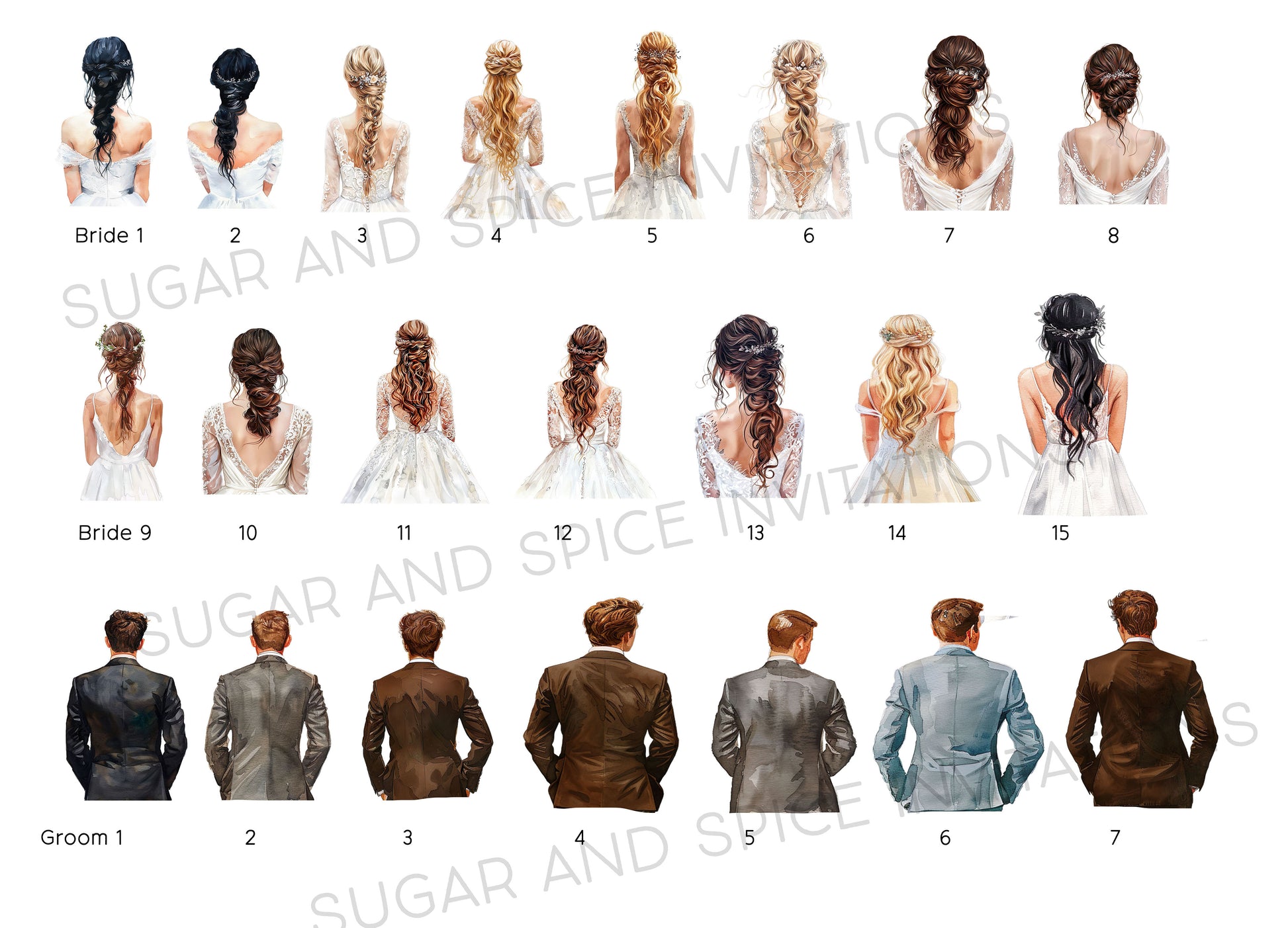 Name of your drinks, # of your Bride, # of your Groom OR Dress and Hair Style. ( I have many colors and shades of hair styles! Just message me what you need!)