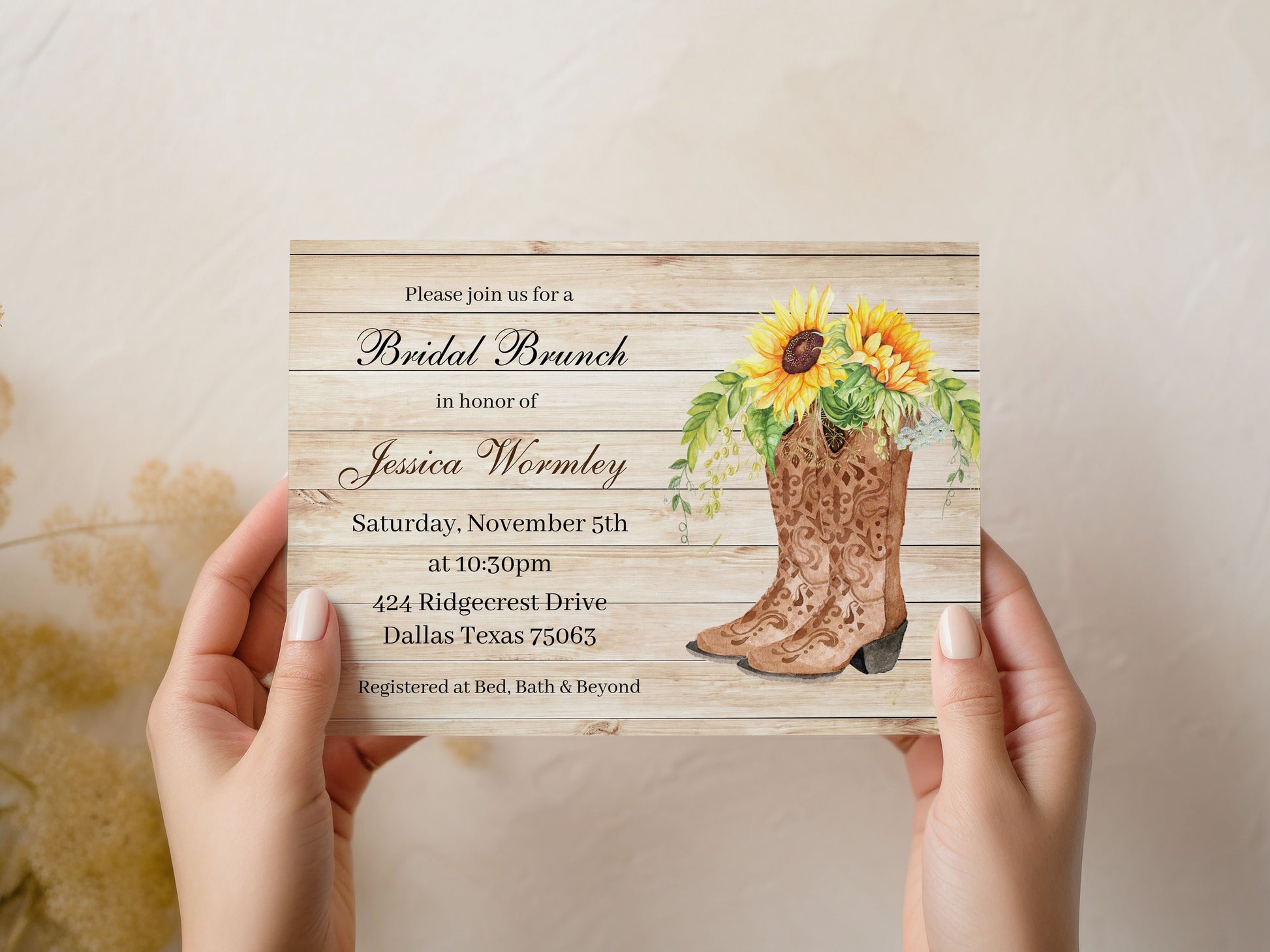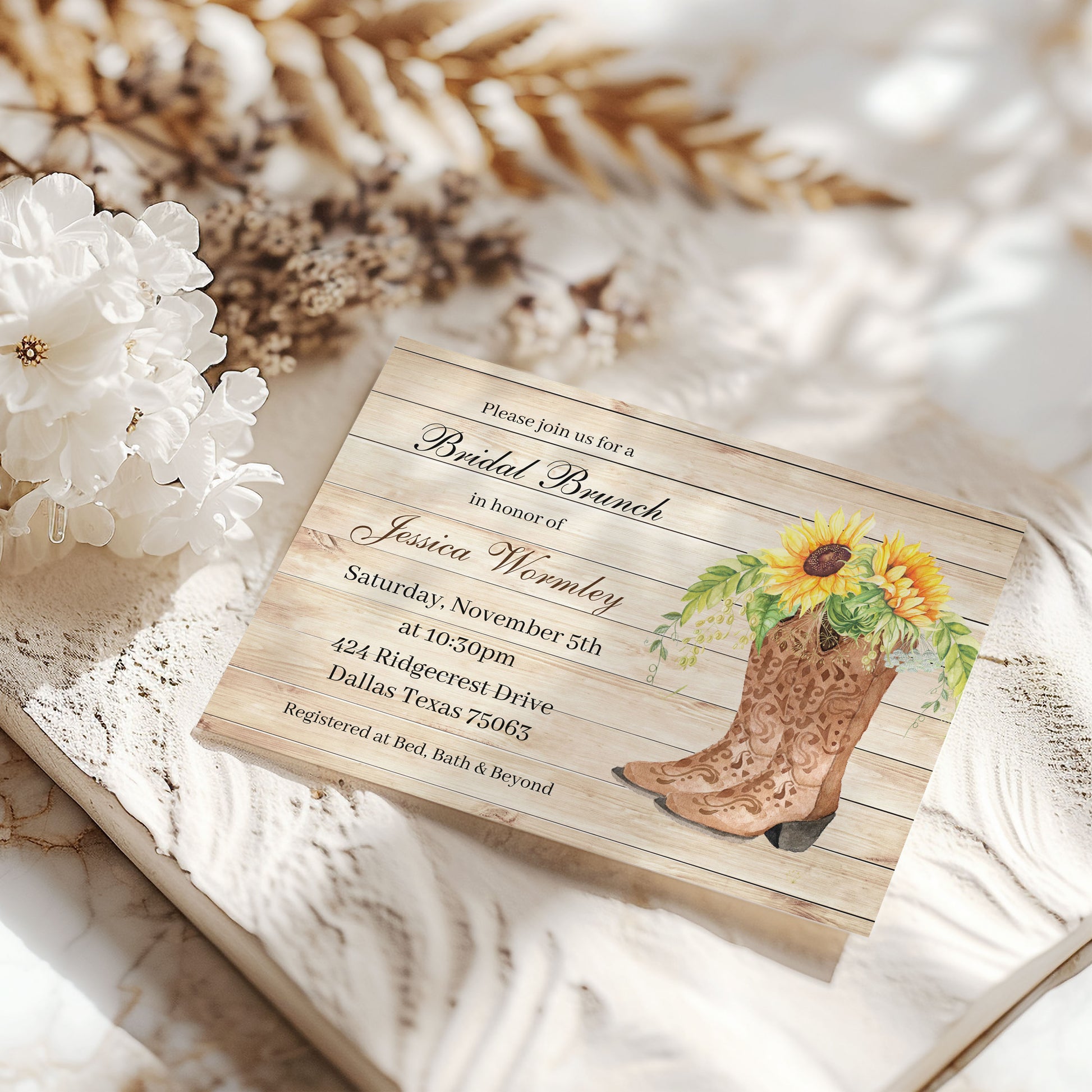 Get ready to kick up your boot-straps and invite the gang 'round for an unforgettable bridal shower with these adorable Country Western Sunflower Bridal Shower Invitations! Show off your country-inspired side with these stylish invites featuring boots, sunflowers, and other charming western-themed details. Yee-haw!