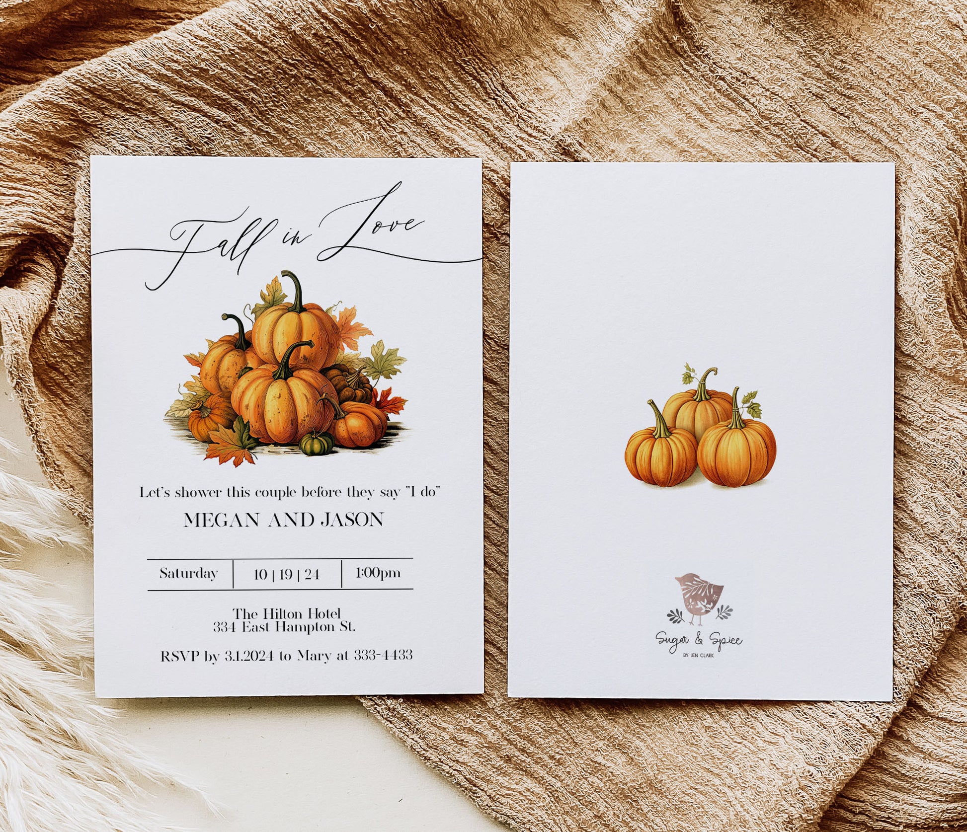 Immerse yourself in the enchanting autumnal atmosphere with our Fall in Love Pumpkins Bridal Shower Invitation. Adorned with charming pumpkins and delicate fall foliage, this invitation sets the perfect tone for a romantic celebration. Fall in love with the details and make your bridal shower unforgettable.