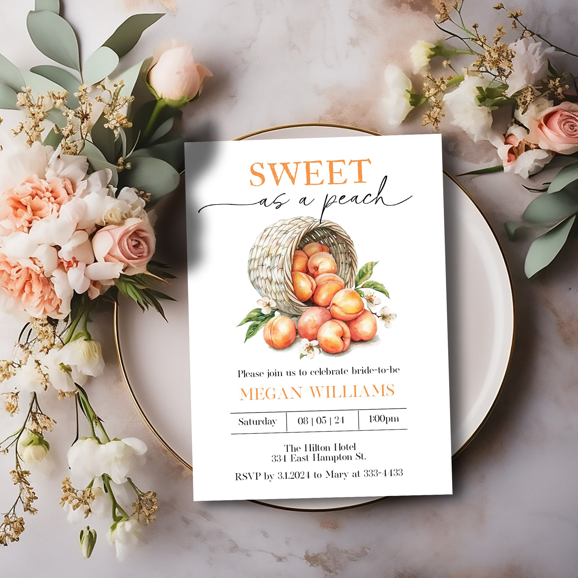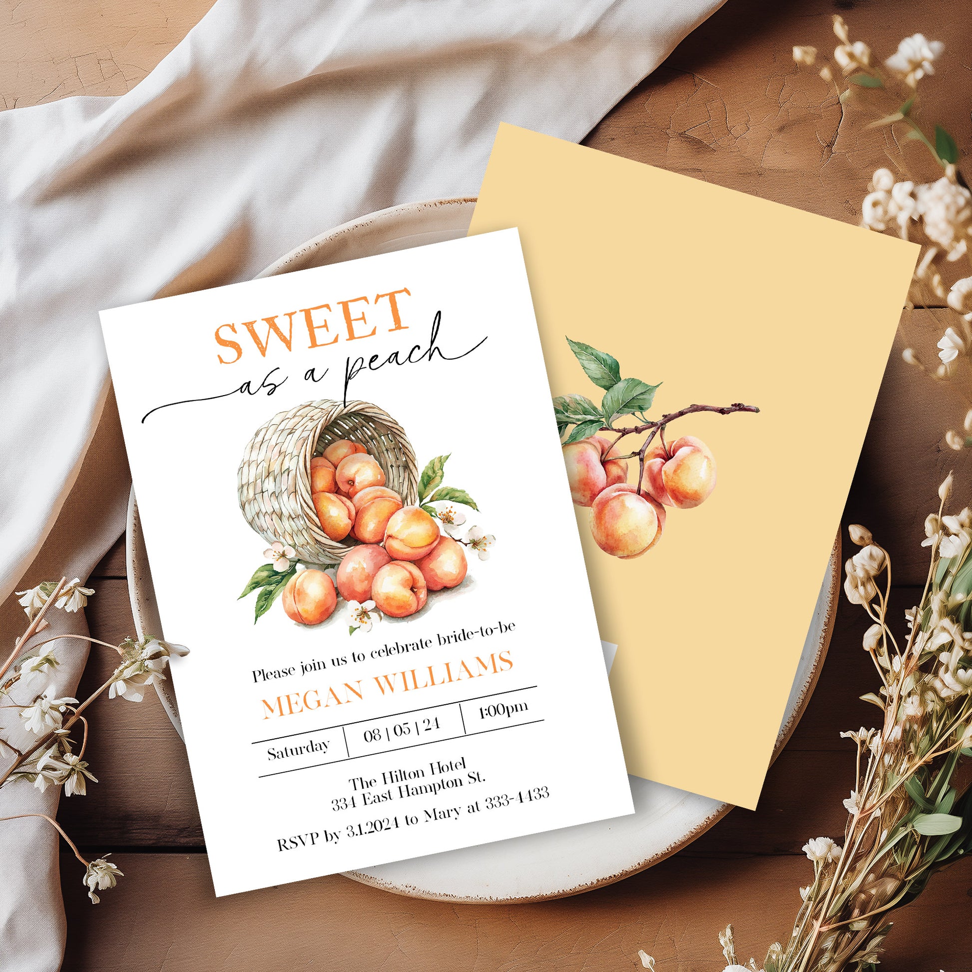 Celebrate your bridal shower with the Sweet as a Peach invitation, designed to perfectly capture a charming and elegant vibe. This invitation features a delicate peach-inspired theme that sets a warm and inviting tone for your special event. Expertly crafted to impress your guests, it combines tasteful design with clear details, making it both beautiful and functional for your celebration.