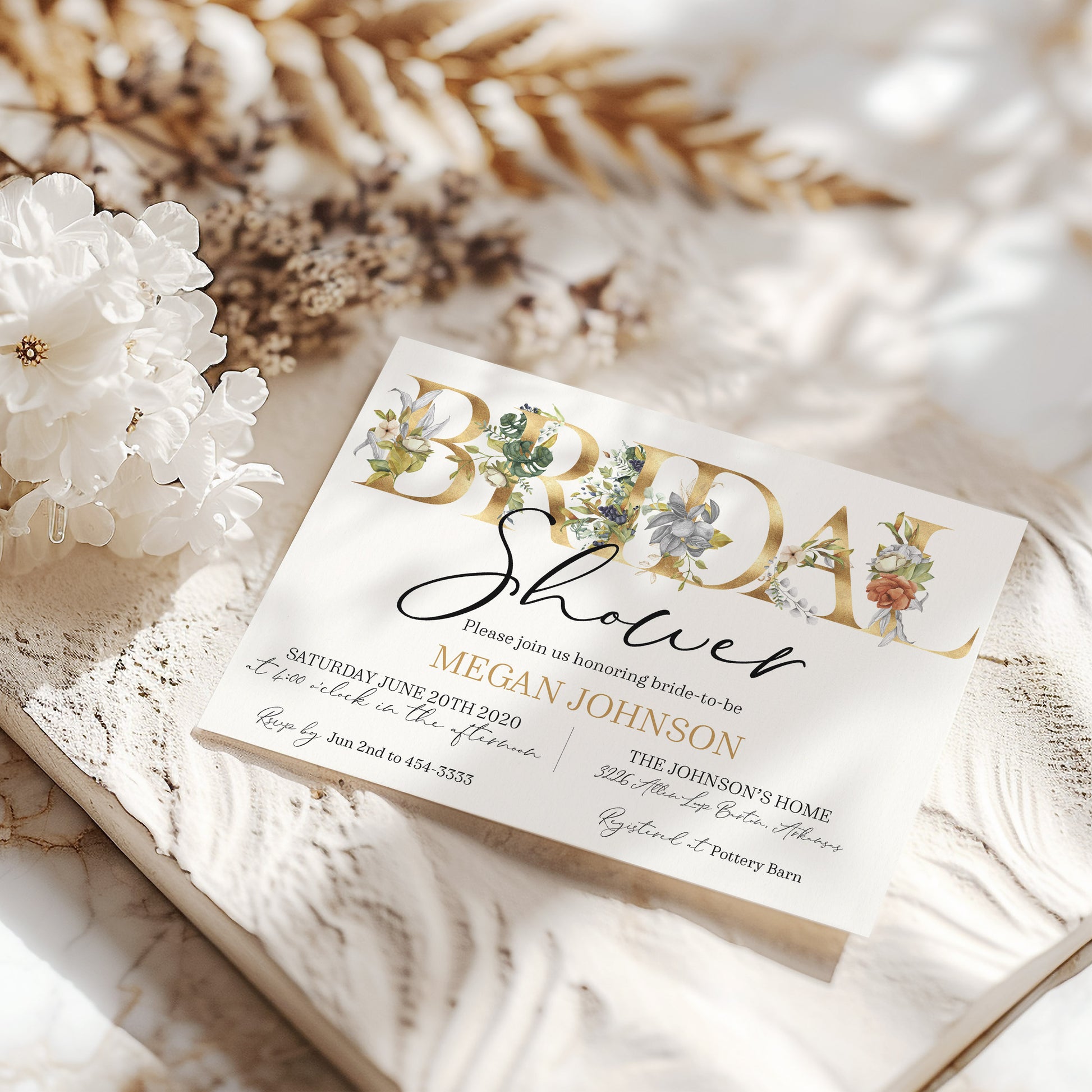 This stunning Gold Letter Floral Bridal Shower Invitation offers a sophisticated aesthetic for your special occasion. Perfect for creating a warm and inviting atmosphere, this invitation features a luxurious gold font and delicate floral artwork.