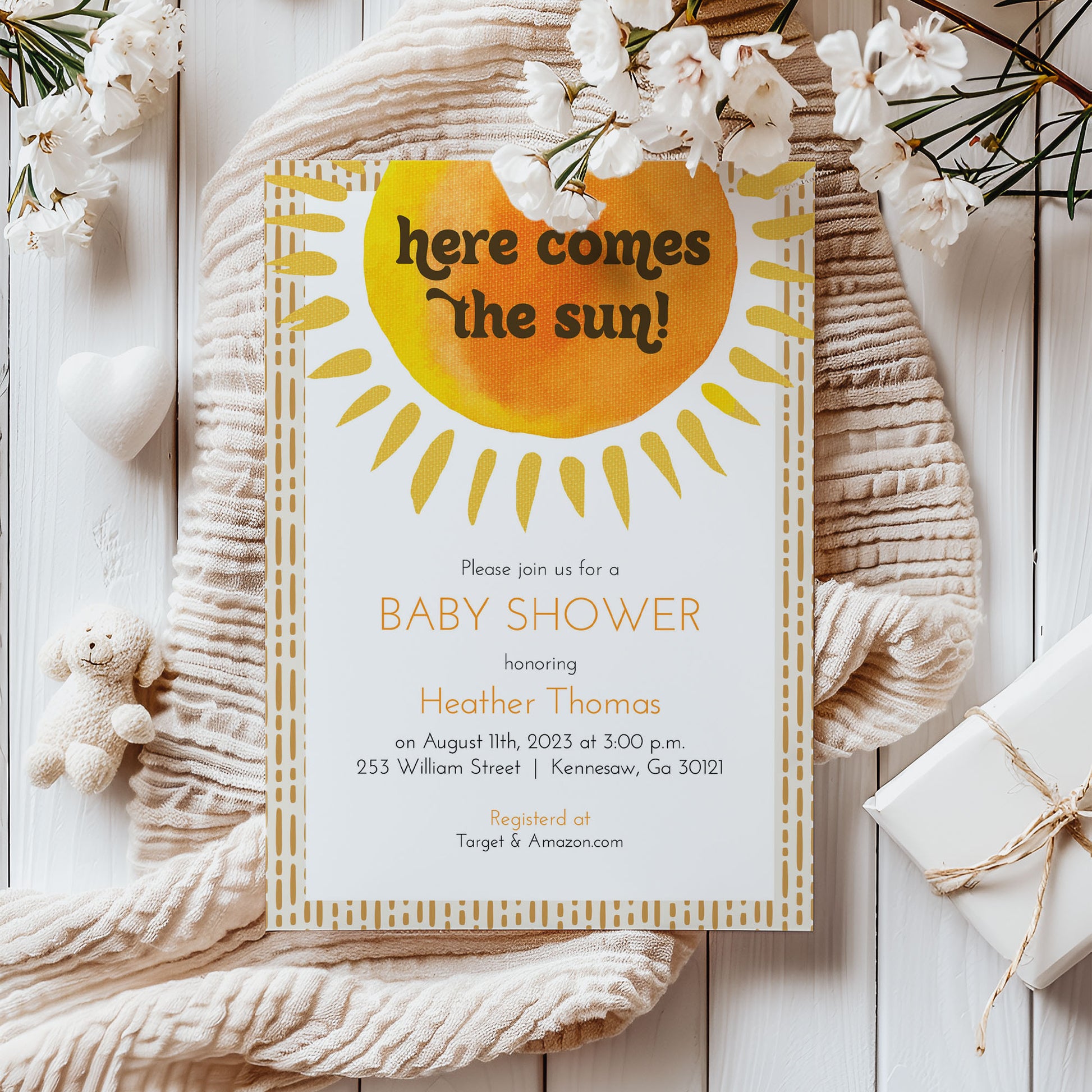 Shine some light on your special day with these Here Comes the Sun Baby Shower Invitations! They will have your guests as giddy as kids at the ice-cream stand, with their boho-inspired design that's sure to make a splash! Brighten up your big day with these unique invitations.