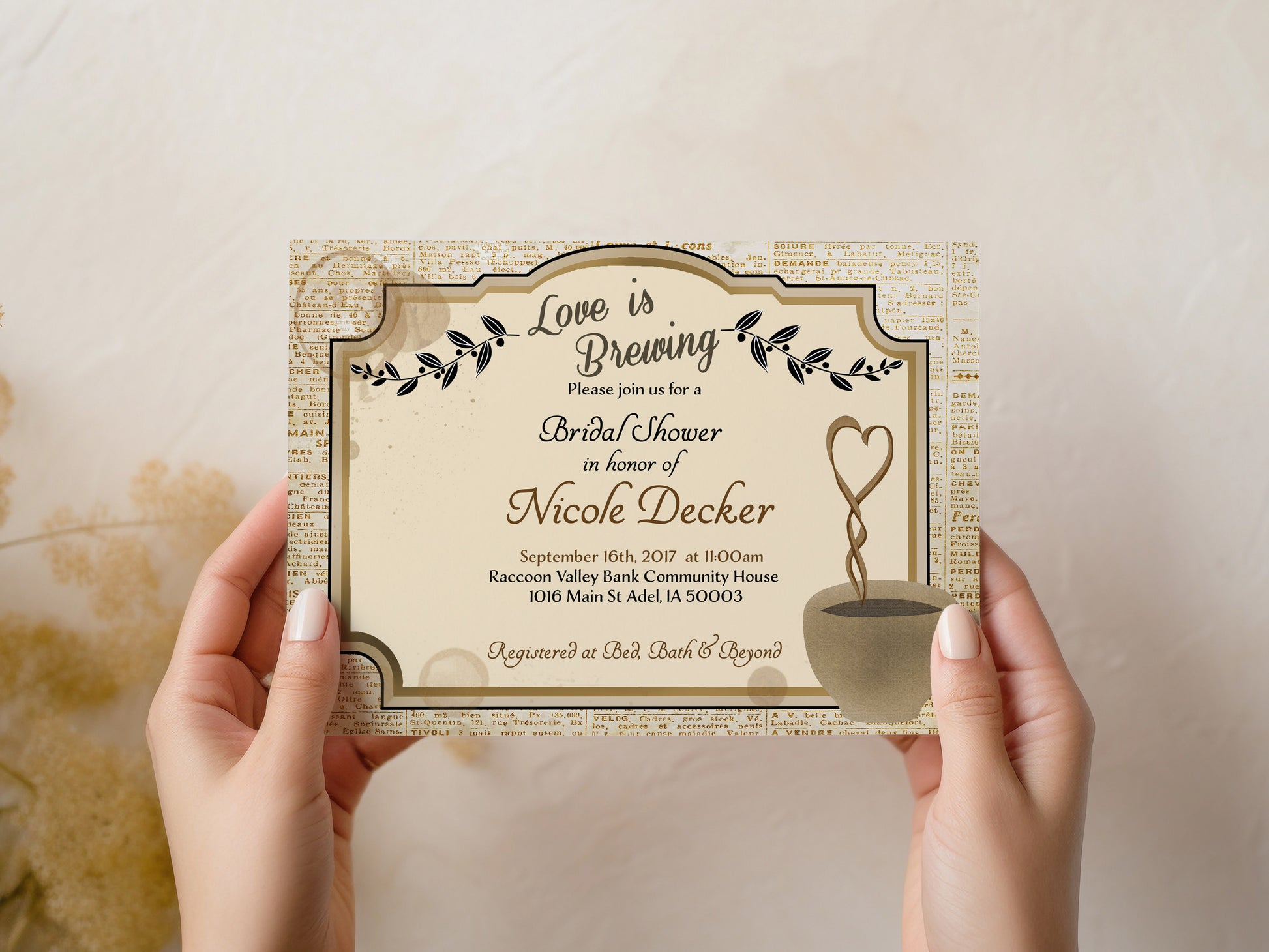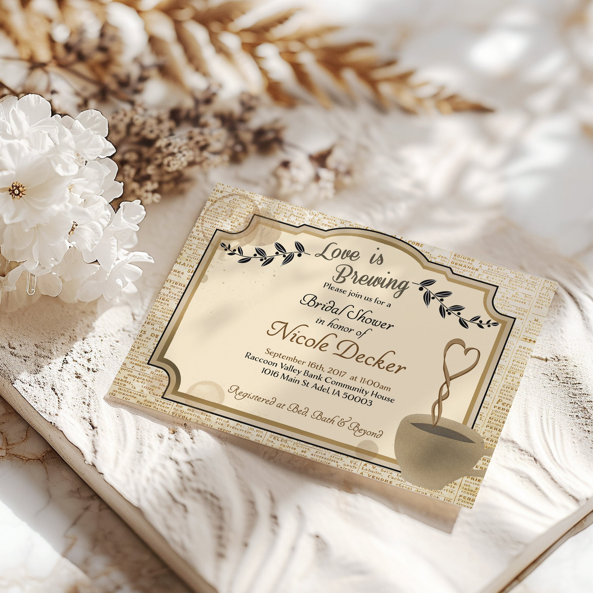This Love is Brewing Coffee Bridal Shower Invitation is a real paper party starter! With a (totally chic) newspaper background, it's the perfect way to spread the news of your upcoming celebration. Perfect for cappuccino-loving couples, now you can say “I do” to a charmingly caffeinated bridal shower!!