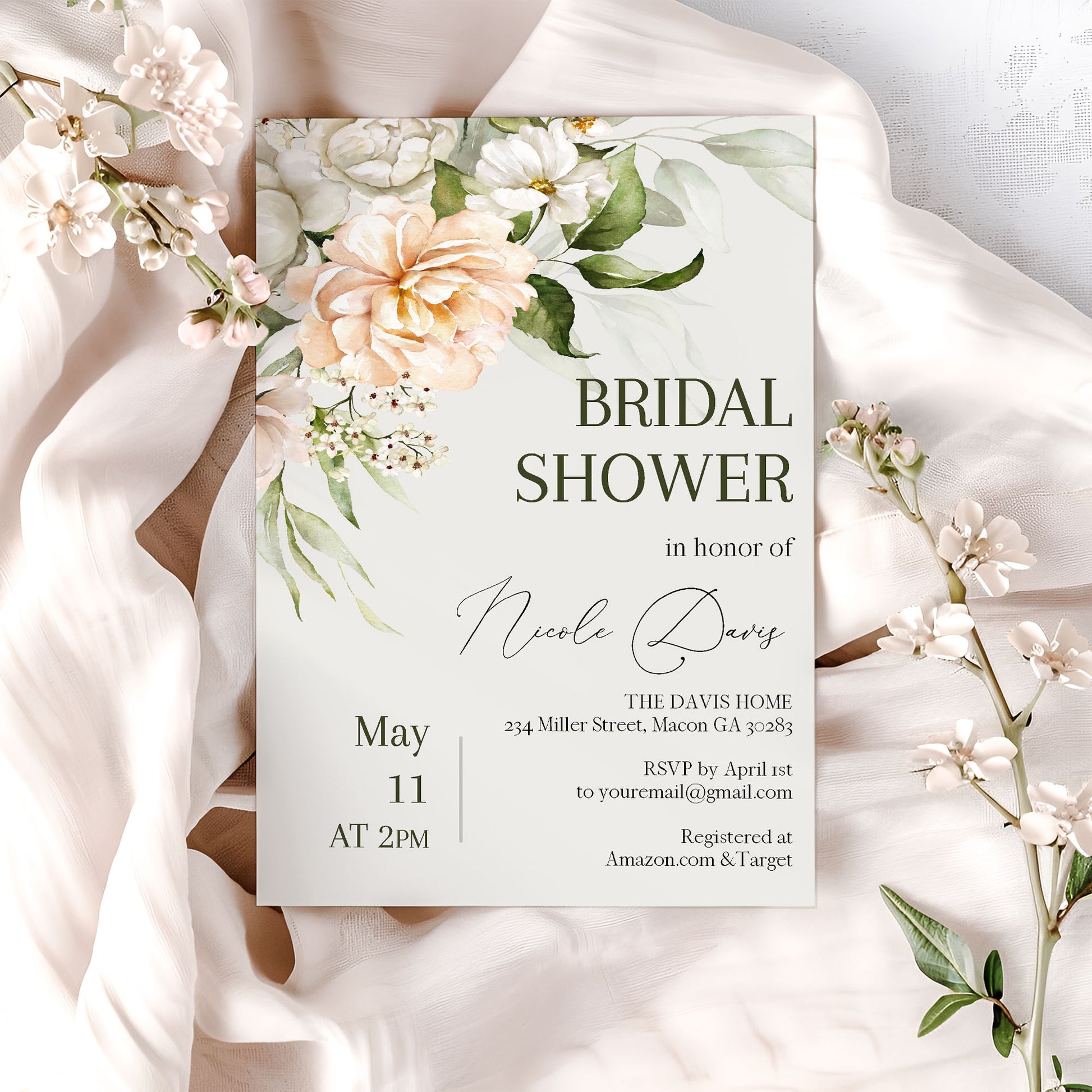 Peach Floral Forest Green Bridal Shower Invitation