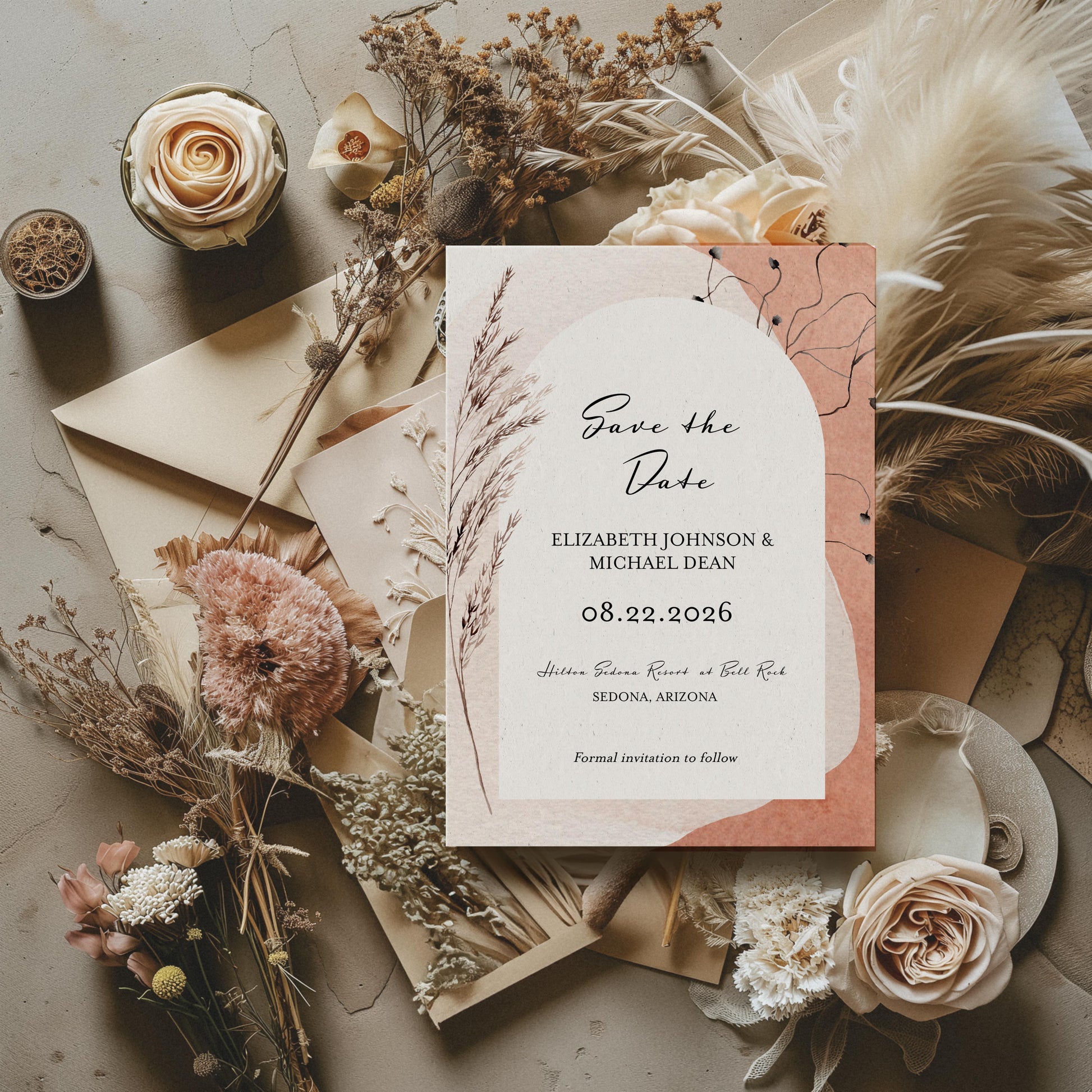 Announce your big day with artistic flair! This Modern Boho Watercolor Arch Save the Date features a stunning hand-painted aesthetic with warm terracotta tones, delicate silhouette florals, and Arizona-inspired watercolor elements. Perfect for couples who love bohemian style and want their guests to know this celebration will be anything but ordinary. Let your unique love story shine through from the very first card.