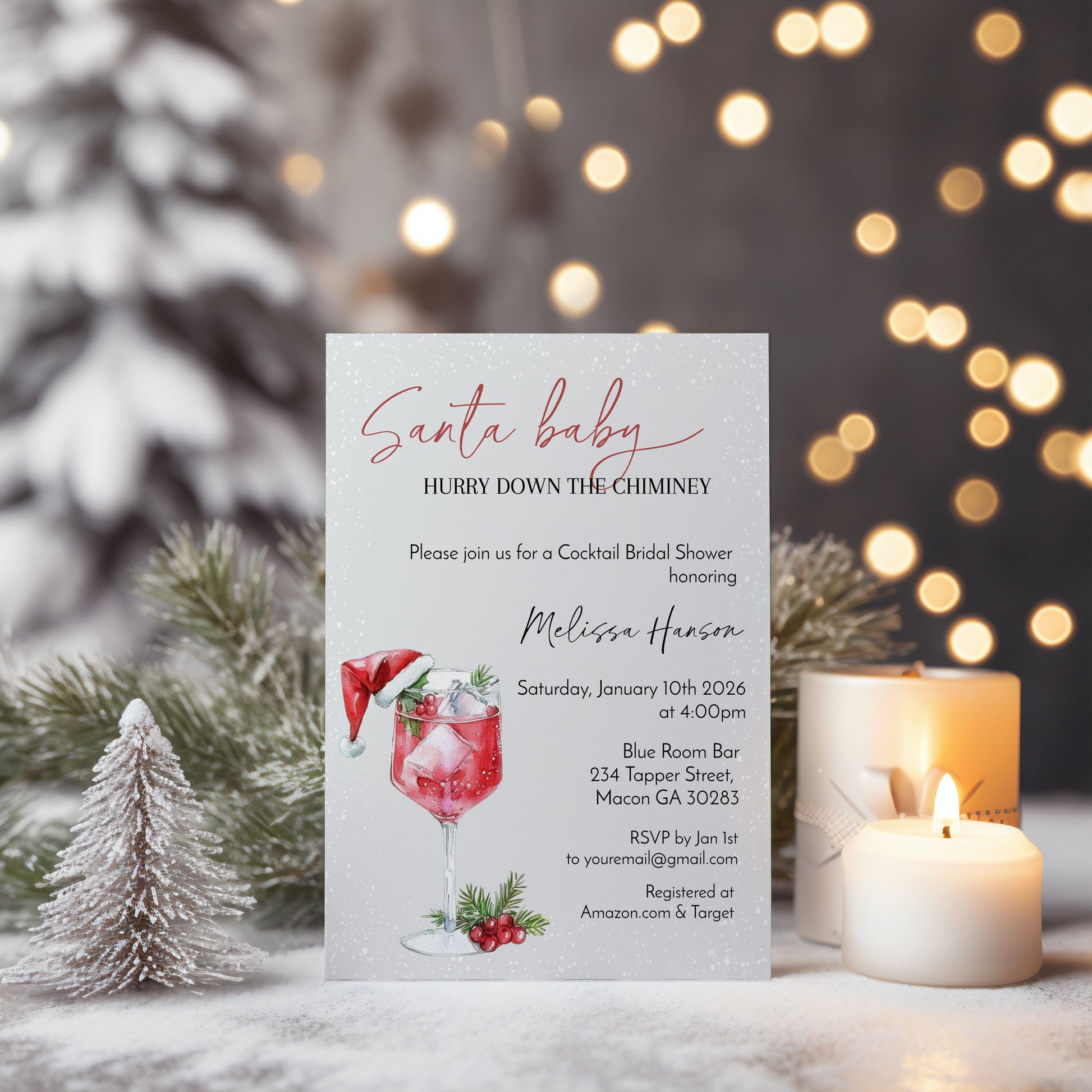 Ring in the holidays with a cheeky celebration! This Santa Baby Cocktail Bridal Shower Invitation blends festive spirit with sophisticated fun, perfect for brides who love a little sass and seasonal sparkle. Featuring a playful design that nods to holiday classics, it sets the tone for an unforgettable pre-wedding bash complete with cocktails and laughter. Personalize with your shower details and give guests a sneak peek at the merry mayhem ahead.